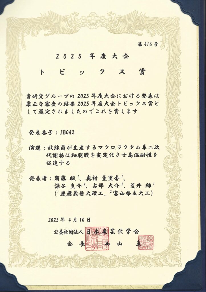 齋藤先生が日本農芸化学会 2025年度大会でトピックス賞を受賞しました!おめでとうございます!